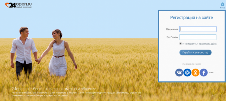 Бесплатный сайт знакомств 24open.ru предлагает два способа онлайн-регистрации: обычная форма введения данных и вход через социальные сети.