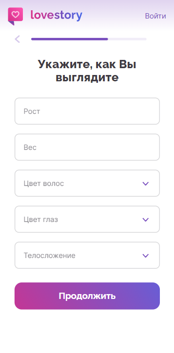 При регистрации на сайте знакомств LoveStory пользователь должен указать свою электронную почту и придумать пароль, следуя стандартной схеме. Однако при заполнении профиля Love Story предлагает опции, которых практически нет на других сервисах знакомств. Помимо относительно обычных данных о пользователе, таких как цель знакомства, портал также предлагает указать рост, вес, тип телосложения, цвет волос и глаз.