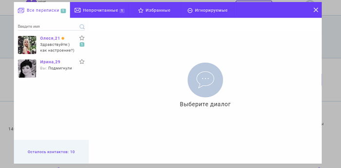 В этой вкладке пользователю доступны все активные чаты,можно просмотреть непрочитанные сообщения, проверить профили, которые находятся в папке “Избранное”, а также пересмотреть список анкет, которые по каким-либо причинам были проигнорированы.