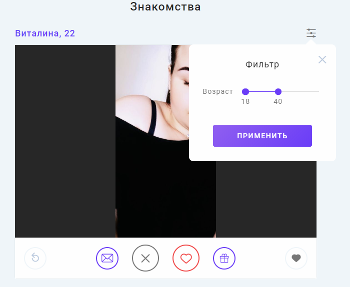 Данный сервис предназначен для оценки анкет, подобранных системой с учетом предпочтений пользователя. Здесь можно поставить профилю лайк (бесплатно), написать сообщение (бесплатно), отправить подарок (платно) или просто проигнорировать анкету и перейти к просмотру следующей. Здесь о владельце профиля отображается минимум информации: одна фотография, имя, возраст. Есть дополнительная возможность отсортировать здесь анкеты по возрасту.