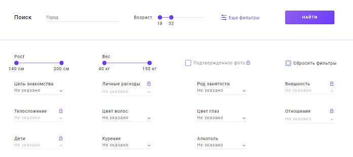 В данном разделе владелец анкеты может самостоятельно организовать поиск интересующего его человека. Алгоритмы поиска позволят ему отфильтровать профили по таким параметрам, как город, возраст, отношение к курению и алкоголю, цвет глаз и волос, род деятельности. Платный тариф несколько расширяет возможности для поиска - анкеты можно отсортировать, выбрав конкретное телосложение человека, наличие или отсутствие у него детей, его материальный достаток и семейное положение.