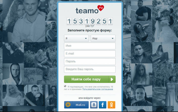 Онлайн-регистрация на сайте Теамо - бесплатна. Вы можете пройти стандартную регистрацию или войти через аккаунт в социальных сетях. Забегая вперед, скажем, что подтверждать анкету нужно через номер мобильного телефона.