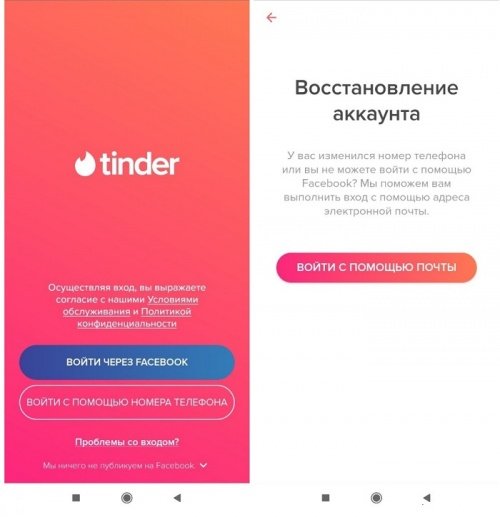 Регистрацию в сервисе можно пройти, воспользовавшись учетной записью Facebook, или с помощью номера телефона, e-mail. Приложение запрашивает доступ к геоданным, так как это позволит системе подобрать анкеты людей, которые находятся поблизости. После заполнения анкеты и создания галереи личных фотографий пользователь переходит в ленту анкет, предлагаемых сервисом. Пользователи могут восстановить аккаунт через e-mail.