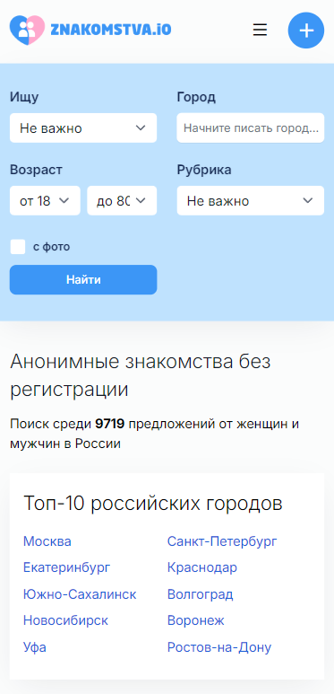 Znakomstva.io — это анонимная платформа для знакомств, позволяющая пользователям находить партнёров для различных типов отношений без необходимости регистрации.